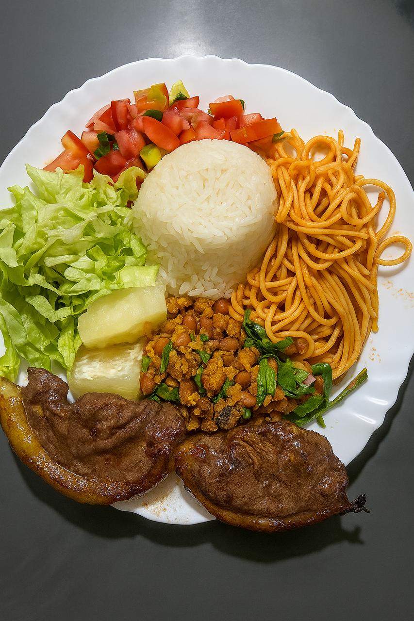 Arroz, Feijão tropeiro, Mandioca, Salada.